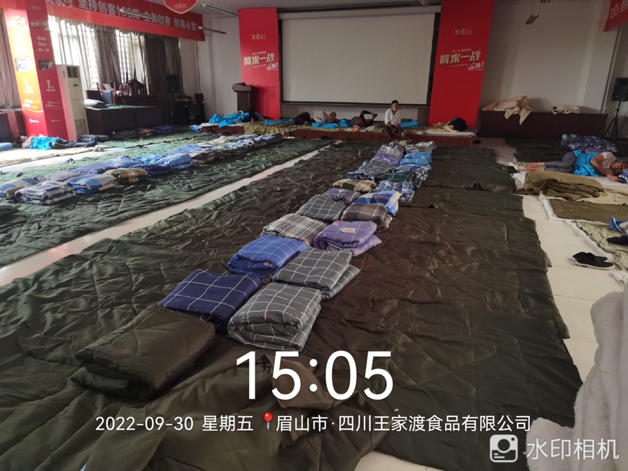 突如其来的疫情让眉山按下了暂停键,但是王家渡食品有限公司不能让眉山老百姓的餐桌也按下暂停键,公司领导班子于2022年9月30日凌晨1:00点召开紧急会议,启动疫情管控紧急预案,坚决不停产,全力确保疫情管控期间产品的正常供应。连夜组织近300名员工进驻工厂,没有住的地方,王家渡人克服万难,在会议室里铺起了一张张临时地铺。